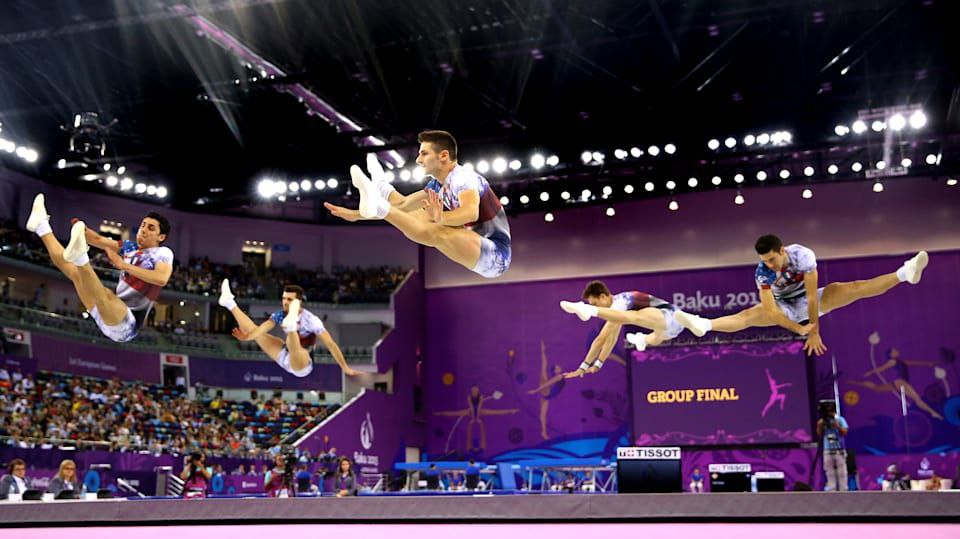 ژیمناستیک ایروبیک که در نتیجهی موج تناسب اندام دهههای 1970 و 1980 شکل گرفت، ترکیبی از حرکات متوالی ورزشهای ایروبیک – شامل هفت حرکت اصلی همراه با حرکات دست – با عناصر دشوار ژیمناستیک، انتقالات خلاقانه و اصیل، همکاری و تعامل بین اعضا و حرکات پرتابی است. این حرکات با الهام از موسیقی انجام میشوند و با ضربآهنگ و عبارات موسیقی هماهنگ شده و از ملودی و تم موسیقی بهطور کلی بهره میبرند.
